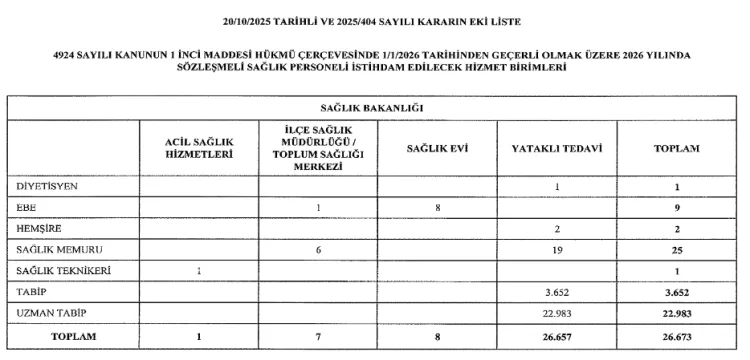 Karar kapsamında toplam 26 bin 673 sözleşmeli sağlık personeli kadrosu ayrıldı.