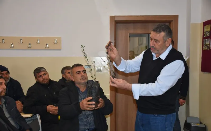Şahinbey Belediyesi'nin Burç Sosyal Tesisleri'nde, ilçedeki Antepfıstığı ve zeytin yetiştiricilerine yönelik budama eğitimi veriliyor.