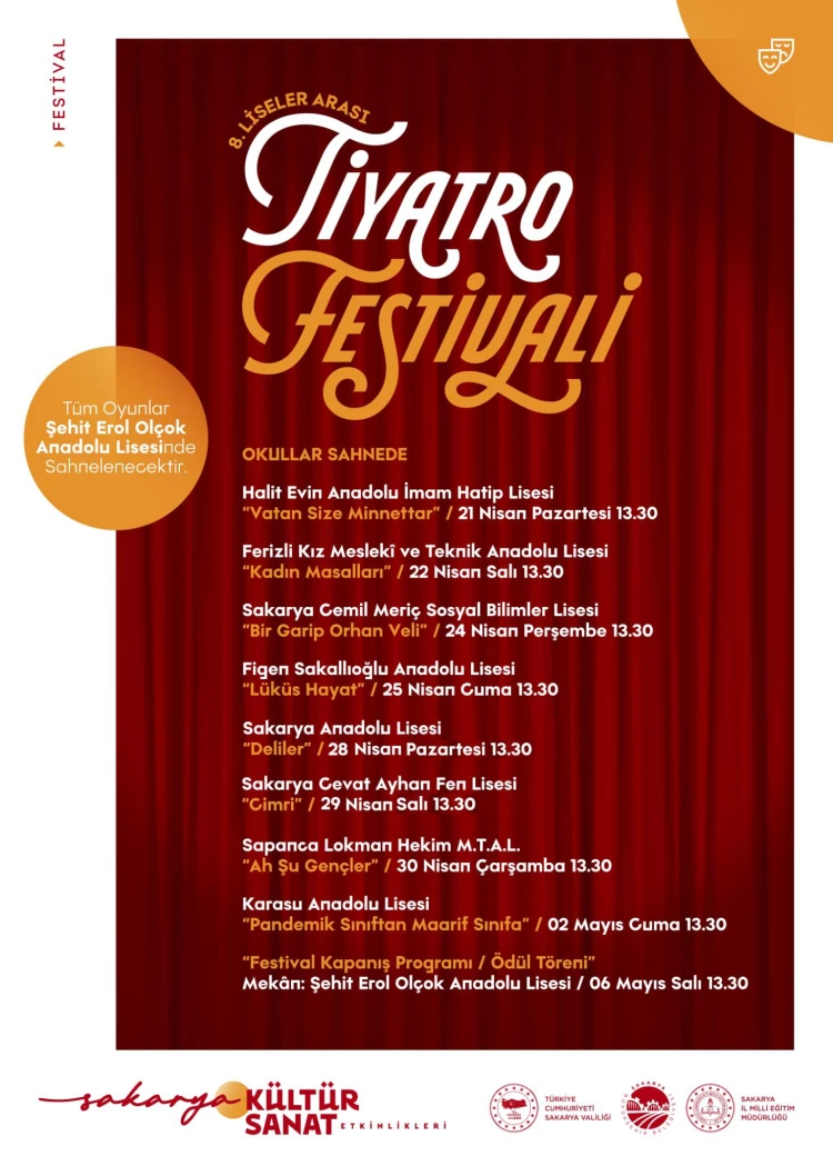 Sakarya’da geleneksel hale gelen Okullar Sahnede Liseler Arası Tiyatro Festivali’nin 8’incisi, 21 Nisan–6 Mayıs 2025 tarihleri arasında düzenleniyor.