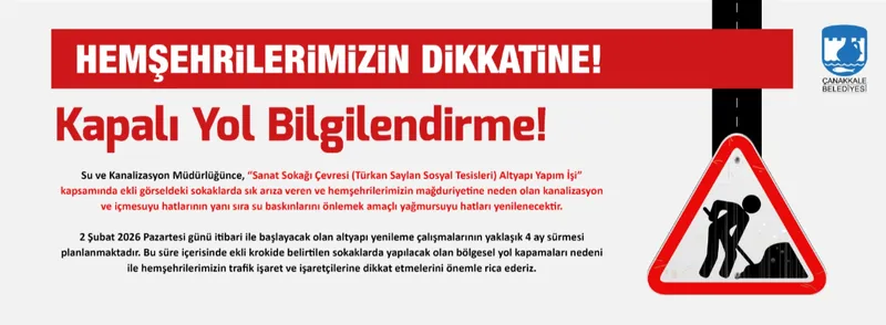 Çanakkale Belediyesi Su ve Kanalizasyon Müdürlüğü, "Sanat Sokağı Çevresi (Türkan Saylan Sosyal Tesisleri) Altyapı Yapım İşi" kapsamında altyapı yenileme çalışmaları gerçekleştirecek. Çalışmalar, sık arıza veren kanalizasyon ve içmesuyu hatlarının yanı sıra, su baskınlarını önlemek amacıyla yağmursuyu hatlarını kapsıyor.
