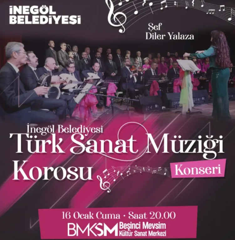 BURSA (İGFA) - Bursa İnegöl Belediyesi Türk Sanat Müziği Korosu, Şef Diler Yalaza yönetiminde sahne alacak. Türk Sanat Müziği’nin hafızalara kazınan, seçkin eserlerinin seslendirileceği konser, 16 Ocak Cuma günü saat 20.00’de Beşinci Mevsim Kültür Sanat Merkezi’nde gerçekleştirilecek. Koro ve saz sanatçılarının güçlü performanslarıyla müzikseverlere unutulmaz bir akşam yaşatması hedefleniyor.