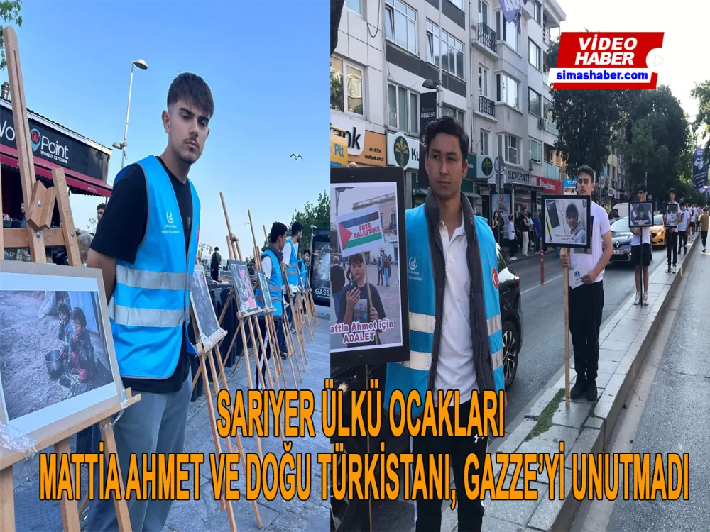 Sarıyer Ülkü Ocakları Başkanlığı mensubu gençler Sarıyer Merkez İDO iskele önünde Çin zülmü altında yıllardır inleyen Doğu Türkistan'lı çocuklar ve Gazze'de yaşam savaşı veren Filistin'li çocukların yaşadığı sıkıntılara dikkat çekmek amacıyla resim sergisi düzenledi. Sergi vatandaşlar tarafından ilgiyle izlenirken, resimleri gören çocukların annelerinin eline sıkıca sarılmaları dikkatlerden kaçmadı. Sarıyer Ülkü Ocakları ikinci etkinliği aynı saatlerde Şehit Mithat Yılmaz caddesi orta refüjünde üzerlerinde baskılı töşerleri ve ellerindeki ülkübordlarında bulunan Mattia Ahmet Menguzzi'nin posterlerini taşıyarak ve bir basın açıklaması yaparak 20 Haziran tarihinde yapılacak olan ikinci duruşma öncesi toplumun dikkatini çekti. İstanbul Ülkü Ocakları geçmiş dönem teşkilat başkanı Vedat Şahin tarafından organize edilen etkinlikler vatandaşların yoğun ilgisi ve desteğiyle karşılanırken Mattia Ahmet Minguzzi'nin tşörtünü giyen ve pankartlarını taşıyan Ülkücü Gençlerin gözlerindeki siyahlığa kadar dikkatli bir şekilde düzenlenen eylem vatandaşlara duygulu anlar yaşatırken, bazı vatandaşlarda pankartlarla birlikte hatıra fotoğrafları çektirdi. Simas Yayın Gurubu olarak son günlerde toplumsal olaylara dikkat çeken etkinliklerde bulunan Sarıyer Ülkü Ocakları başkanı Ümit Kapıyoldaş ve ülkücü gençleri tebrik ediyoruz.
