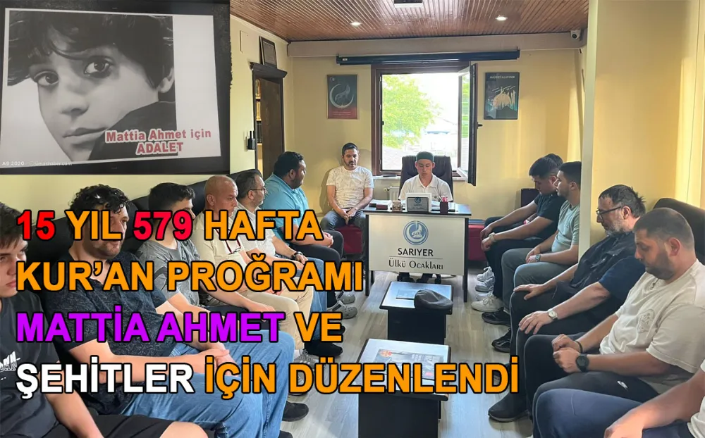 Sarıyer Ülkü Ocakları Başkanlığında başlayan ve ülke geneline yayılarak 15 yıl 579 hafta aralıksız her Perşembe akşamı düzenlenen Kur'an Kerim tilaveti bu akşam geçtiğimiz aylarda bıçaklanarak öldürülen ve tüm ülkenin üzüntüsüne neden olan 14 yaşındaki Mattia Ahmet Minguzzi ve şehitlerimiz için okundu. Toplumsal olaylara gösterdiği duyarlılık ile bilinen Ülkü Ocakları geçtiğimiz haftalarda düzenlediği 'Uyuşturucuya Hayır' mitinginden sonra yarın 13 Haziran Cuma günü saat 17'de hem 20 Haziran tarihinde duruşması yapılacak olan Mattia Ahmet Minguzzi ve yıllardır Çin zülmü altında eziyet çeken Doğu Türkistan'lı soydaşlarımızın sorunlarına dikkat çekmek amacıyla Sarıyer İDO iskelesi önünde resim sergisi ve ‘Ülkübord’ çalışması yapılacak. Sarıyer Ülkü Ocakları Başkanı Ümit Kapıcıoğlu, 15 senedir aralıksız olarak devam eden Kur'anı Kerim Tilaveti proğramımıza okulların tatil olması nedeniyle Eylül ayına kadar ara veriyoruz, ara vermeden önceki son proğramızı 14 yaşındayken hunnarca öldürülen Mattia Ahmet Minguzzi ve şehitlerimizin ruhları için okuttuk. Kamuoyunun dikkatini 20 Haziran tarihinde yapılacak olan ikinci duruşmaya çekmek geçmiş dönem İstanbul Ülkü Ocakları Teşkilat başkanımız Vedat Şahin koordinatörlüğünde ülkübord çalışması ve yıllarca Çin zülmü altında ezilen Doğu Türkistanlı soydaşlarımızın sorunlarına dikkat çekmek için İDO önünde saat 17 de resim sergisi düzenleyeceğiz. Sarıyer halkını sergimize davet ediyoruz açıklamasınnda bulundu.