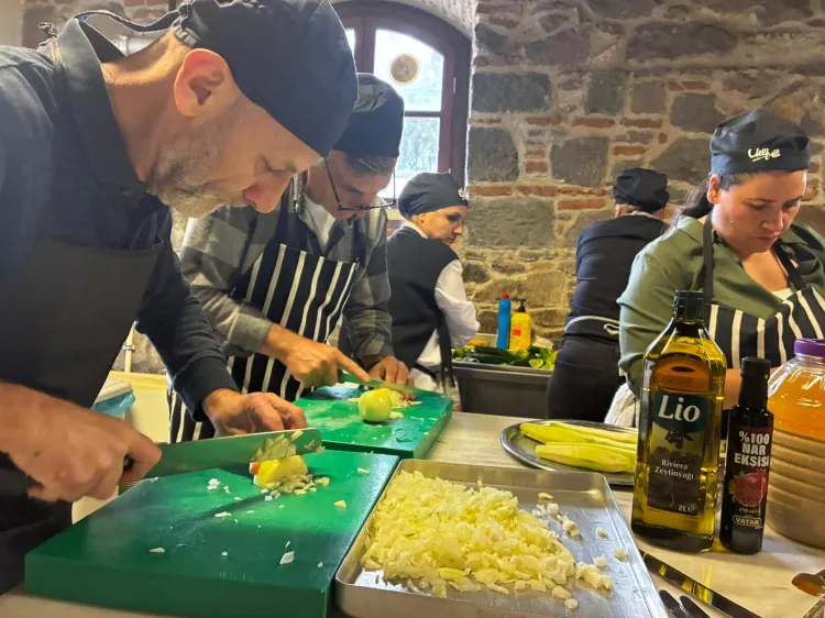 İZMİR (İGFA) - İzmir Büyükşehir Belediyesi Meslek Fabrikası’nın sağır ve işitme engelli bireylere yönelik pastacı çıraklığı kursundan mezun olan kursiyerler, ünlü şef Rıfat Yurttaş ile keyifli bir atölyede bir araya geldi. Çeşme’de restoranı bulunan ve sosyal medyada paylaştığı tariflerle geniş bir takipçi kitlesine ulaşan Yurttaş, kursiyerlerle birlikte Ege mutfağının karakteristik meze ve zeytinyağlılarını hazırladı.
