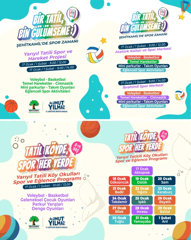 “Bir Tatil Bin Gülümseme” projesi ile de Atatürk Kültür ve Spor Merkezi ile İbrahimli Spor Merkezi’nde 17 Ocak-1 Şubat tarihleri arasında her gün 09.00-14.00 saatleri arasında çeşitli spor ve eğlence etkinlikleri gerçekleştirilecek.