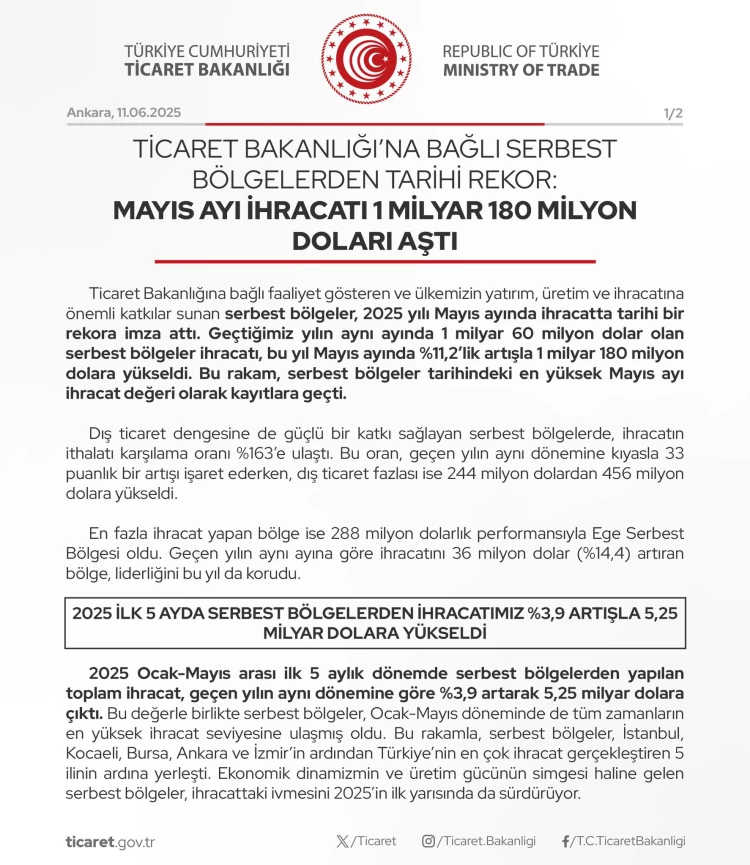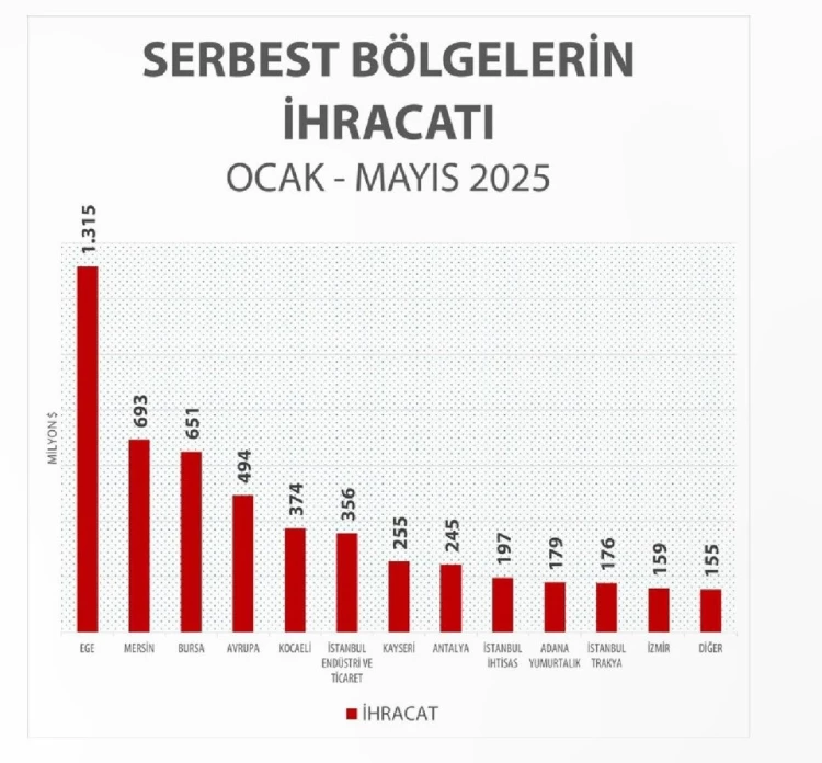 Ticaret Bakanlığı, serbest bölgelerin Mayıs 2025 ihracatının geçen yıla göre yüzde 11,2 artarak 1 milyar 180 milyon dolara ulaştığını duyurdu. İlk beş ayda toplam ihracat ise 5,25 milyar dolar oldu.