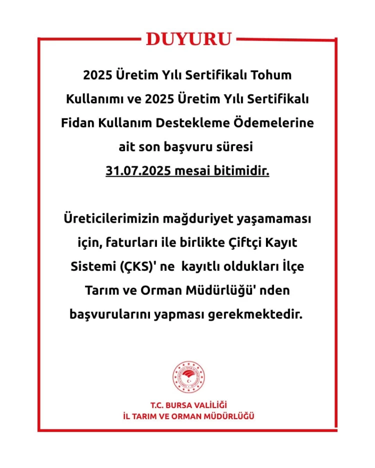 Bursa İl Tarım ve Orman Müdürlüğü, 2025 Üretim Yılı Sertifikalı Tohum ve Fidan Kullanım Destekleme Ödemeleri için son başvuru tarihinin 31 Temmuz 2025 olduğunu duyurdu