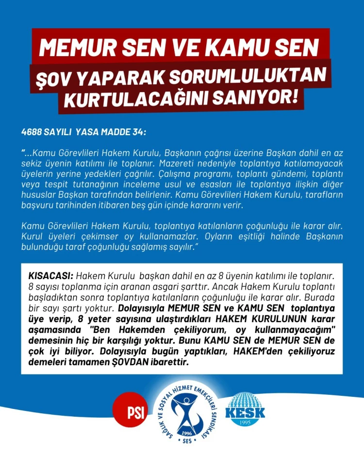 SES Genel Merkezi, Memur-Sen ve Kamu-Sen’in 8. Dönem Toplu Sözleşme Hakem Kurulu’ndan çekilme kararını “şov” olarak nitelendirdi. 4688 sayılı Yasa’ya göre, çekilmenin karar sürecine etkisi olmadığını belirten SES, sendikaların sorumluluktan kaçtığını savundu.