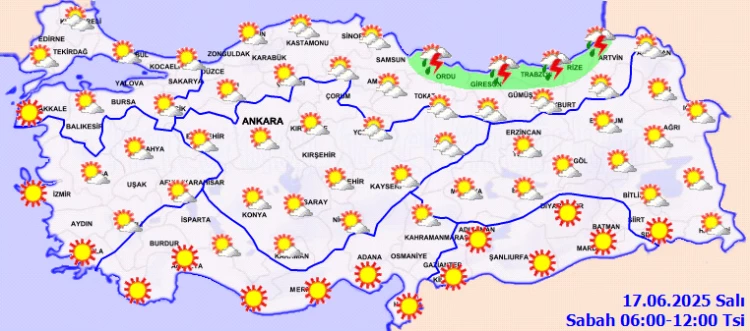 Ülkemizin kuzey ve doğu kesimlerinin parçalı, yer yer çok bulutlu, Doğu Karadeniz ve Ordu çevreleri ile Doğu Anadolu'nun kuzeydoğusunun yerel sağanak ve gök gürültülü sağanak yağışlı, diğer yerlerin az bulutlu ve açık geçeceği tahmin ediliyor.