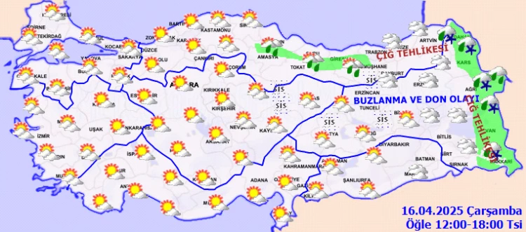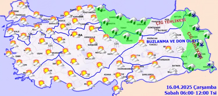 Sabah ve gece saatlerinde Marmara’nın güney ve doğusu, Batı Karadeniz, İç Anadolu ve Doğu Anadolu’nun batısında pus ve sis etkili olacak. İç ve doğu kesimlerde ise sabah ve gece saatlerinde buzlanma ve don olaylarına karşı dikkatli olunması gerekiyor. Ayrıca, Doğu Karadeniz’in iç kesimlerinin yüksek bölgeleri ile Doğu Anadolu’nun eğimli ve yüksek alanlarında çığ tehlikesi bulunuyor.