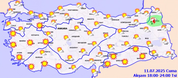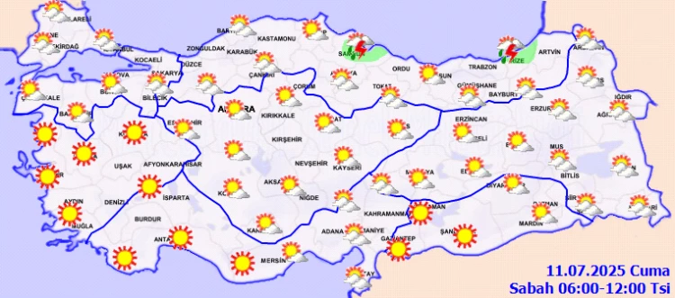 ANKARA (İGFA) - Meteoroloji Genel Müdürlüğü 11 Temmuz Cuma gününe ilişkin hava tahmin raporunu yayımladı. Meteoroloji Genel Müdürlüğü tarafından yapılan tahminlere göre, yurdun kuzey kesimlerinin parçalı, yer yer çok bulutlu, Samsun, Rize, Artvin, Kars ve Ardahan ile Van’ın doğu kesimlerinin yerel olmak üzere sağanak ve gök gürültülü sağanak yağışlı, diğer yerlerin az bulutlu ve açık geçeceği tahmin ediliyor.
