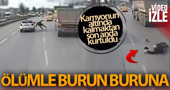 Kameraya yansıyan görüntülerde, otobanda karşıdan karşıya geçmeye çalışan vatandaşa bir aracın çarpmasının ardından vatandaşın yola savrulması ve diğer şeritten gelen kamyonun altında kalmaktan son anda kurtulması yer alıyor.