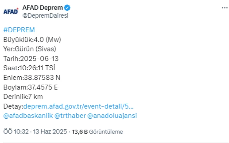 ANKARA (İGFA) - AFAD verilerine göre, merkez üssü Sivas'ın Gürün ilçesi olan 4 büyüklüğünde deprem kaydedildi.