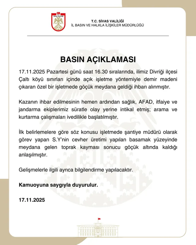 Sivas Valiliği’nin açıklamasına göre, olay 17 Kasım Pazartesi günü saat 16.30 sıralarında gerçekleşti.