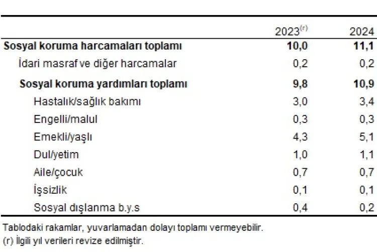 Sosyal koruma yardımlarında en büyük pay, 2 trilyon 276 milyar TL ile emekli ve yaşlılara yapılan ödemelere ait olurken, hastalık ve sağlık bakımı harcamaları 1 trilyon 528 milyar TL ile ikinci sırada yer aldı. Sosyal koruma harcamalarının GSYH içindeki payı yüzde 11,1, sosyal koruma yardımlarının GSYH içindeki payı ise yüzde 10,9 olarak gerçekleşti.