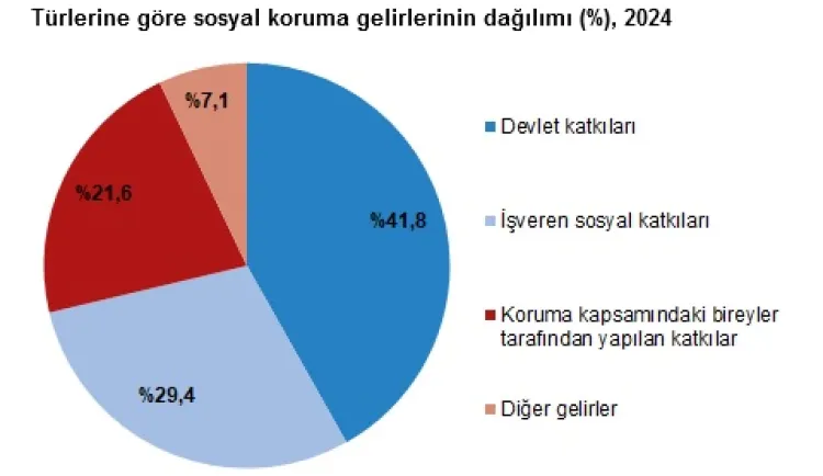 Sosyal koruma gelirlerinde devlet katkıları yüzde 41,8 ile en yüksek paya sahip olurken, işveren katkıları yüzde 29,4, bireylerin sosyal katkıları ise yüzde 21,6 olarak kaydedildi.