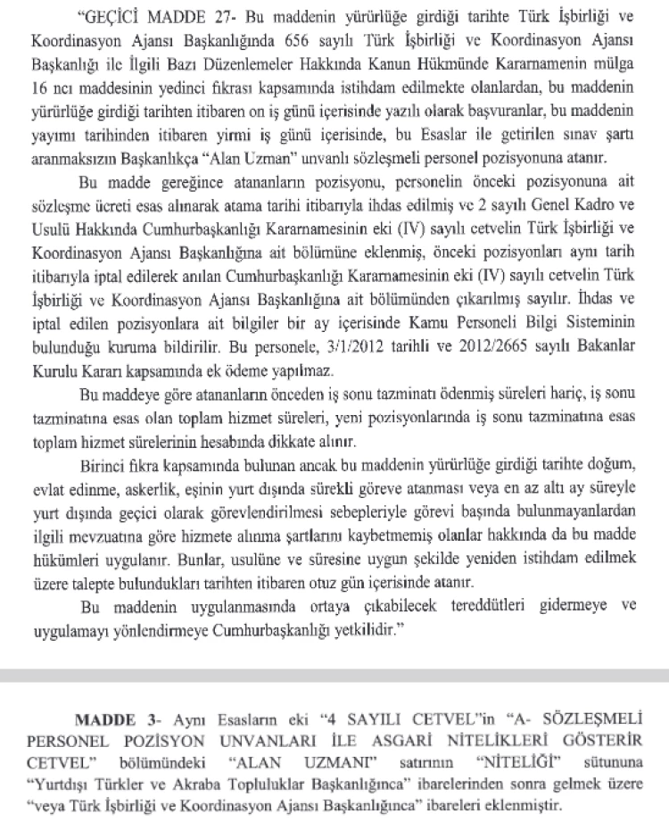 Söz konusu kararda; Türk İşbirliği ve Koordinasyon Ajansı Başkanlığı'nda istihdam edilmek üzere alınacak Alan Uzmanı unvanlı sözleşmeli personel, bağlı olmaksızın anılan Bakanlıkça belirlenecek usul ve esaslara göre yapılacak yazılı ve/veya sözlü sınav sonucuna göre çalıştırılabileceği belirtildi.