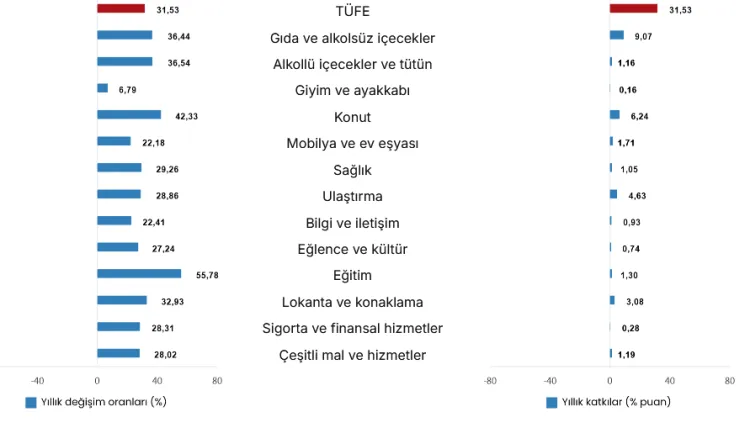 En yüksek ağırlığa sahip üç ana harcama grubunun yıllık değişimlerde; gıda ve alkolsüz içecekler yüzde 36,44 artış, ulaştırma yüzde 28,86 artış, konut, su, elektrik, gaz ve diğer yakıtlar yüzde 42,33 artış oldu. Bu grupların yıllık enflasyona katkısı ise gıdada 9,07 puan, ulaştırmada 4,63 puan ve konutta 6,24 puan olarak hesaplandı.