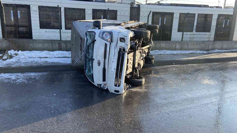 Sultangazi’de sürücüsünün direksiyon hakimiyetini kaybettiği kamyonet kaldırıma çarparak yan yattı. Kaza sonrası duyarlı bir vatandaş, başka kaza olmaması için el hareketleriyle trafiği yavaşlatmaya çalıştı.