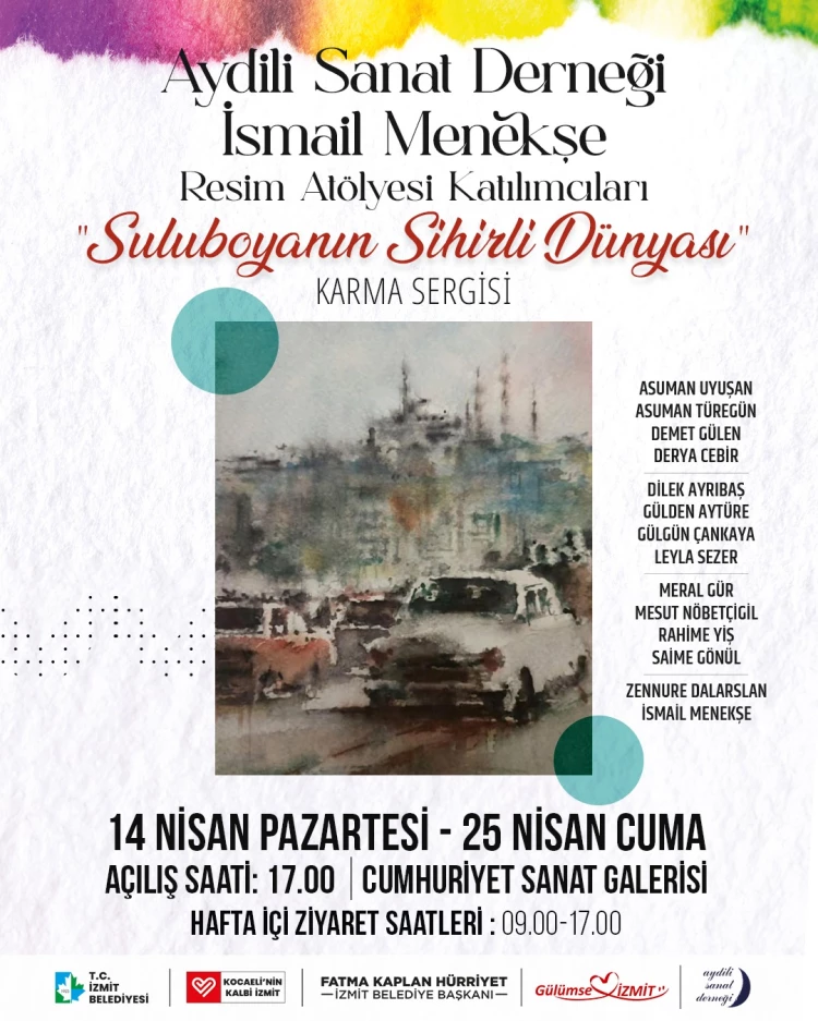 Kocaeli İzmit Belediyesi, Aydili Sanat Derneği bünyesinde faaliyet gösteren İsmail Menekşe Resim Atölyesi katılımcılarının eserlerinden oluşan ‘Suluboyanın Sihirli Dünyası’ karma sergisine ev sahipliği yapacak.