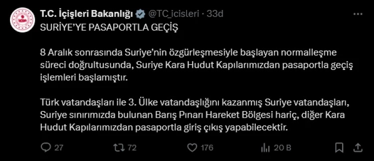 İçişleri Bakanlığı, Suriye’nin özgürleşmesi sonrası normalleşme kapsamında Türk vatandaşları ve üçüncü ülke vatandaşlığını kazanmış Suriyelilerin, Barış Pınarı Harekât Bölgesi hariç, Suriye Kara Hudut Kapıları’ndan pasaportla geçiş yapabileceğini duyurdu.