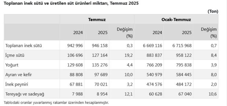 Temmuz 2025 süt ve süt ürünleri üretim istatistiklerini açıklayan TÜİK, ticari süt işletmeleri tarafından toplanan inek sütü miktarının bir önceki yılın aynı ayına göre yüzde 0,3 artarak 946 bin 158 ton olduğunu açıkladı. Süt ürünleri üretiminde genel yükseliş gözlenirken, içme sütü üretimi yüzde 19,2'lik rekor artış gösterdi.