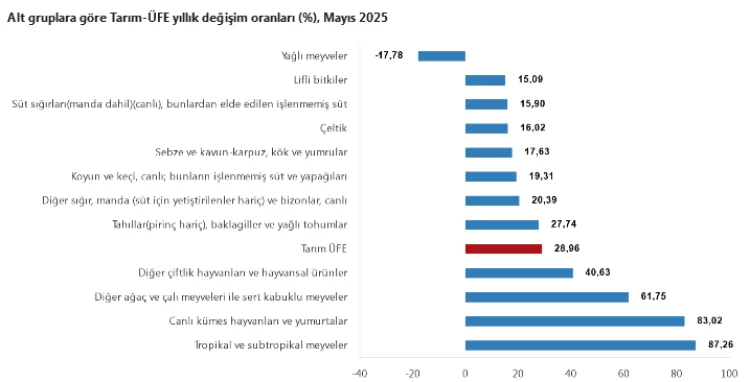 TÜİK verilerine göre, 2025 Mayıs ayında Tarım Ürünleri Üretici Fiyat Endeksi yıllık bazda yüzde 28,96, aylık bazda yüzde 0,23 artış gösterdi. Tropikal meyvelerde yıllık artış yüzde 87,26 ile rekor kırarken, sebzelerde aylık yüzde 14,61 düşüş yaşandı.