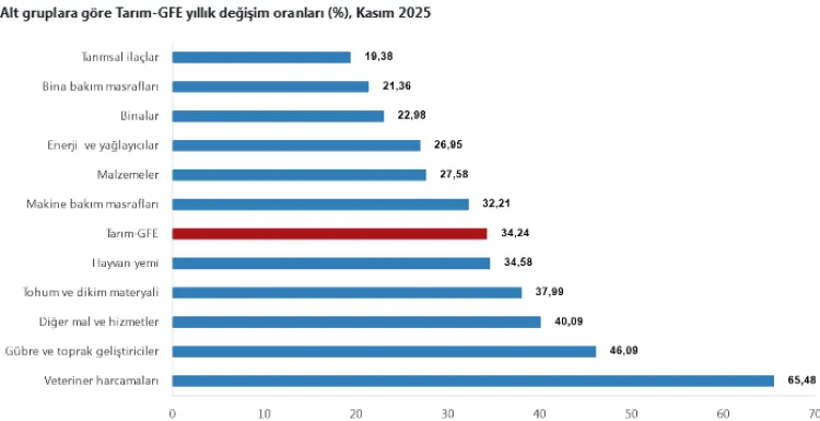TÜİK’in Kasım ayı verilerine göre Tarımsal Girdi Fiyat Endeksi (Tarım-GFE) aylık yüzde 1,84, yıllık ise yüzde 34,24 artış gösterdi. En yüksek yıllık artış veteriner harcamalarında görüldü. Veriler, tarımsal üretimde maliyet baskısının Kasım ayında da devam ettiğini ortaya koydu.