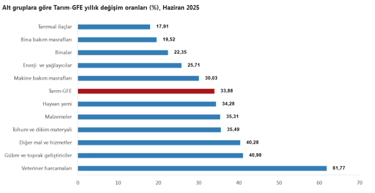 Türkiye İstatistik Kurumu (TÜİK), Haziran 2025 Tarım-Girdi Fiyat Endeksi (Tarım-GFE) verilerini açıkladı. Endeks, bir önceki aya göre yüzde 2,52, geçen yılın aynı ayına göre yüzde 33,88 artış gösterirken, veteriner harcamaları ve gübrede yüksek artışlar dikkat çekti.