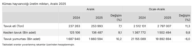 Aralık ayında geçen yılın aynı ayına kıyasla da artış dikkat çekti. Tavuk yumurtası üretimi yüzde 10,2, kesilen tavuk sayısı yüzde 9,1 ve tavuk eti üretimi yüzde 7,1 oranında yükseldi.