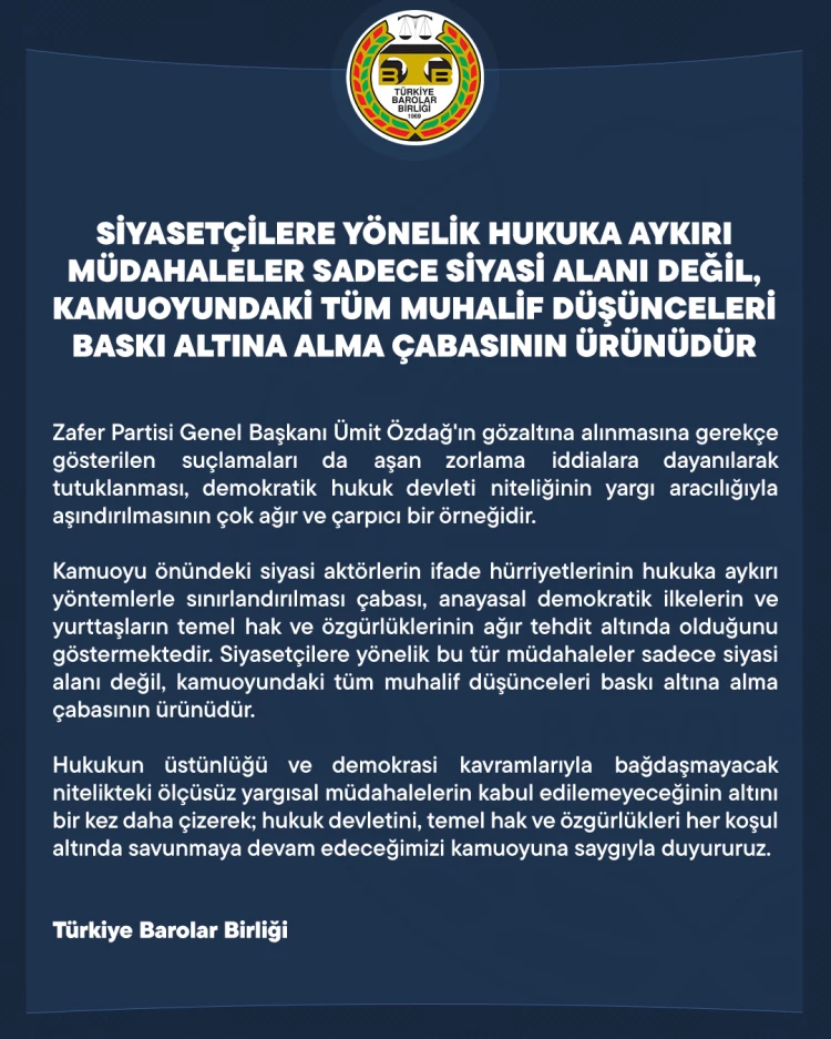 Türkiye Barolar Birliği (TBB), Zafer Partisi Genel Başkanı Ümit Özdağ'ın tutuklanmasıyla ilgili yaptığı yazılı açıklamada, siyasetçilere yönelik bu tür müdahalelerin sadece siyasi alanı değil, kamuoyundaki tüm muhalif düşünceleri baskı altına alma çabasının ürünü olduğunu belirtti.