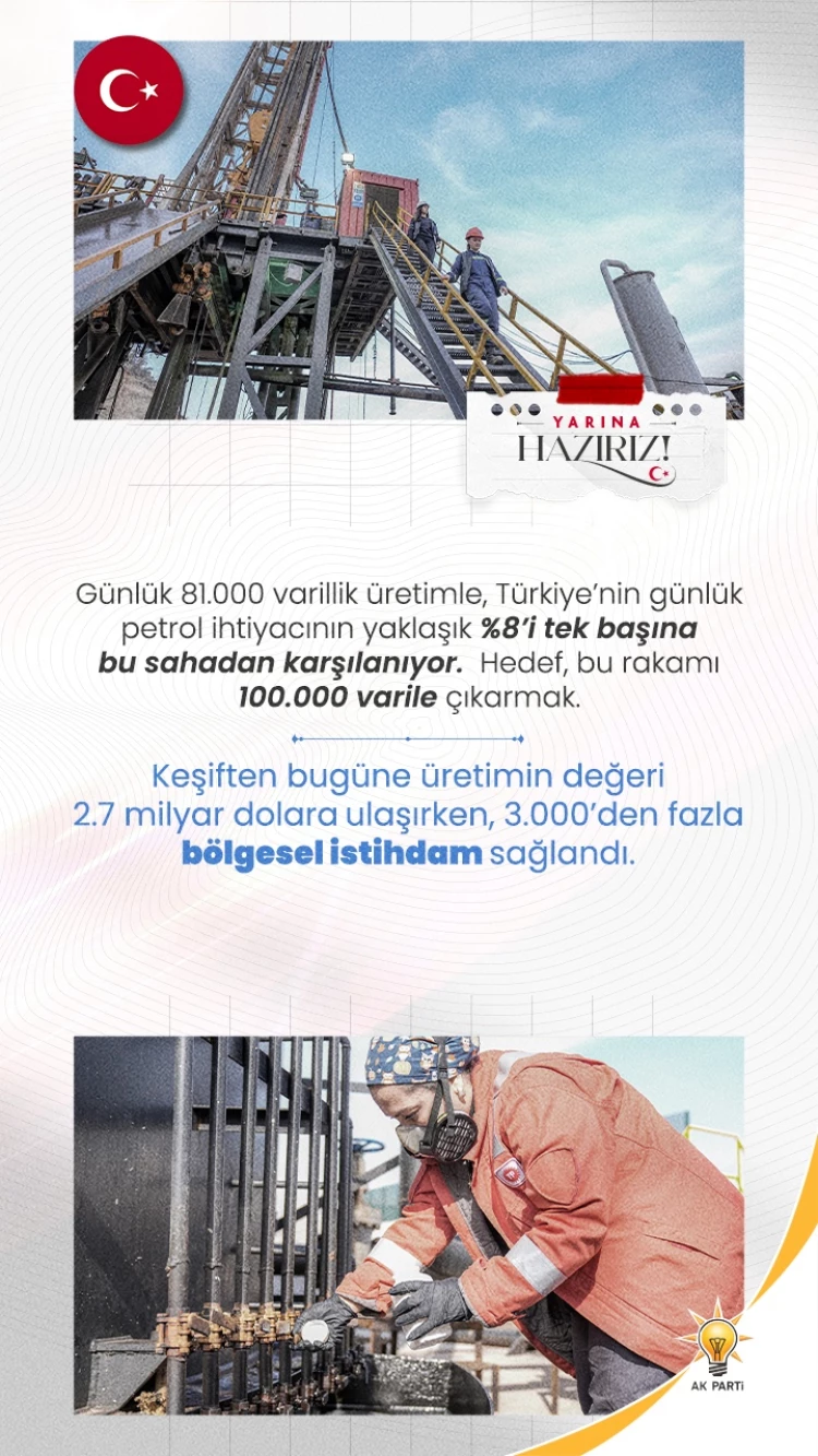 Enerji ve Tabii Kaynaklar Bakanı Alparslan Bayraktar ise, programda yaptığı konuşmada enerji alanındaki gelişmeleri paylaşarak, “Sayın Cumhurbaşkanımız Karadeniz’den yeni bir müjde verdi. 75 milyar metreküplük rezerv keşfettik” dedi. Bakan Bayraktar, günlük 81 bin varillik üretimle, Türkiye'nin günlük petrol ihtiyacının yaklaşık yüzde 8'i tek başına bu sahadan karşılandığını belirterek, "Hedef bu rakamı 100 bin varile çıkarmak" dedi.