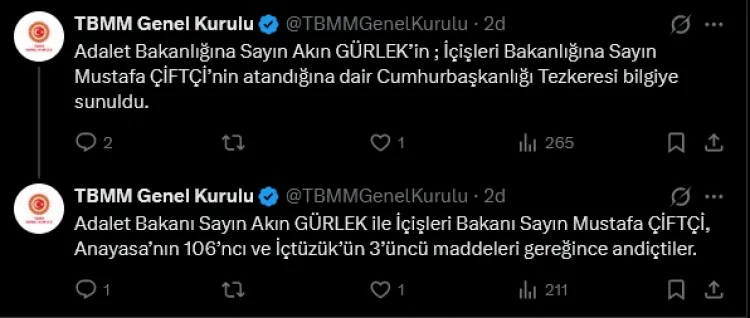 Kabine değişikliğinin ardından Adalet Bakanı Akın Gürlek ve İçişleri Bakanı Mustafa Çiftçi TBMM Genel Kurulu’nda yemin etti. CHP ve AK Parti arasında tartışmaların yaşandığı törende, vekillerin müdahalesi nedeniyle tören kısa süreli gerginliklerle gerçekleşti.
