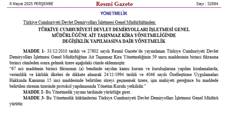 ANKARA (İGFA) - TCDD Genel Müdürlüğü’ne ait Taşınmaz Kira Yönetmeliği’nde yapılan değişiklikle, kamu kurum ve kuruluşlarına yapılan kiralamalarda yeni bir düzenleme getirildi.