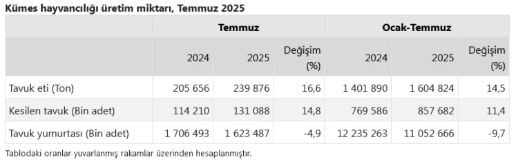 ANKARA (İGFA)- Türkiye İstatistik Kurumu (TÜİK), Temmuz 2025 kümes hayvancılığı üretim istatistiklerini açıkladı.
