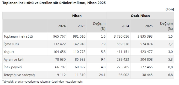 Nisan ayında bir önceki yılın aynı ayına göre, inek peyniri üretimi yüzde 4,8 arttı, ayran ve kefir üretimi yüzde 9,4 arttı, yoğurt üretimi yüzde 5,8 arttı, içme sütü üretimi yüzde 7,9 arttı, tereyağı ve sadeyağ üretimi yüzde 24,1 arttı.