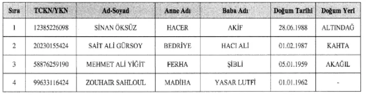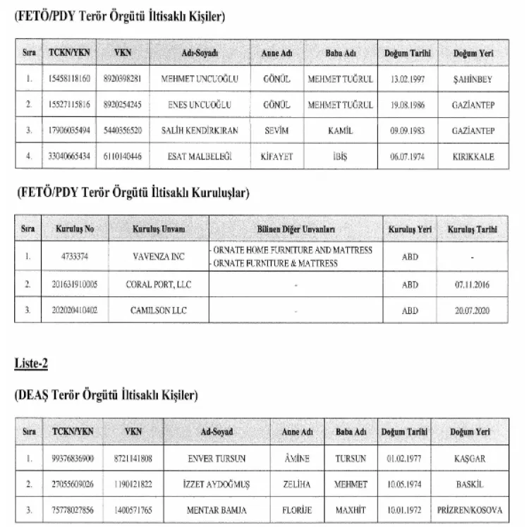 Öte yandan daha önceki yıllarda (2021-2023 dönemlerinde) FETÖ/PDY ve DEAŞ bağlantısı şüphesiyle malvarlığı dondurulan 4 kişi hakkında alınan kararlar da kaldırıldı. Bu kişiler artık mal varlıkları üzerindeki kısıtlamalardan kurtuldu.