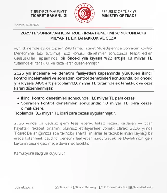 Bakanlık tarafından yapılan yazılı açıklamada, ikincil kontrol ve sonradan kontrol denetimleri sonucunda toplam 13,6 milyar TL tutarında ek tahakkuk ve ceza kararı düzenlendiği bildirildi.