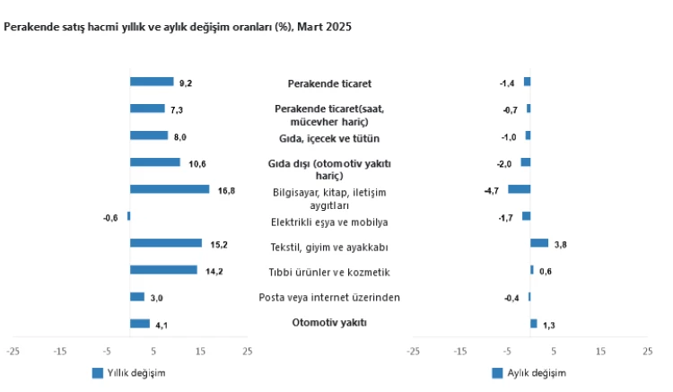Ticaret satış hacmi Mart 2025’te yıllık yüzde 10,8 artarken, perakende satış hacmi yüzde 9,2 yükseldi. Saat ve mücevher hariç perakende satışlar ayrıca yayımlanmaya başlandı.