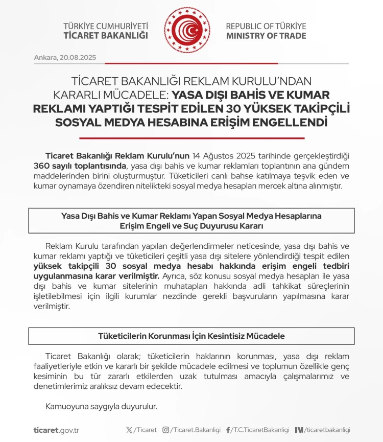 Ticaret Bakanlığı Reklam Kurulu, yasa dışı bahis ve kumar reklamı yapan 30 yüksek takipçili sosyal medya hesabına erişim engeli getirdi. Hesaplar ve ilgili siteler hakkında suç duyurusunda bulunulacak
