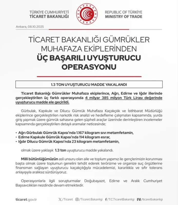 Ticaret Bakanlığı Gümrükler Muhafaza ekipleri, Ağrı, Edirne ve Iğdır’da düzenlediği operasyonlarda 4 milyar 385 milyon TL değerinde 1.3 ton uyuşturucu madde yakaladı. Gürbulak’ta bin 167 kg sıvı metamfetamin, Kapıkule’de 114 kg esrar, Dilucu’da 23 kg metamfetamin ele geçirildi.