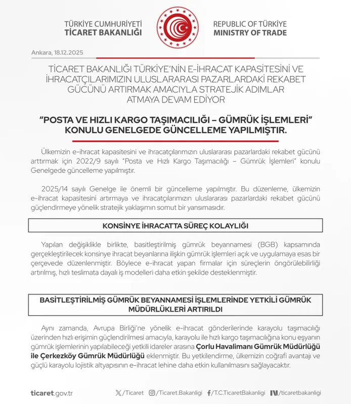 Ticaret Bakanlığı, e-ihracat kapasitesini artırmak ve ihracatçının uluslararası pazarlarda rekabet gücünü güçlendirmek için 2025/14 sayılı “Posta ve Hızlı Kargo Taşımacılığı – Gümrük İşlemleri” Genelgesi’nde güncellemeler yaptı. Düzenlemeyle konsinye ihracat ve basitleştirilmiş gümrük işlemleri daha hızlı ve öngörülebilir hâle getirildi.