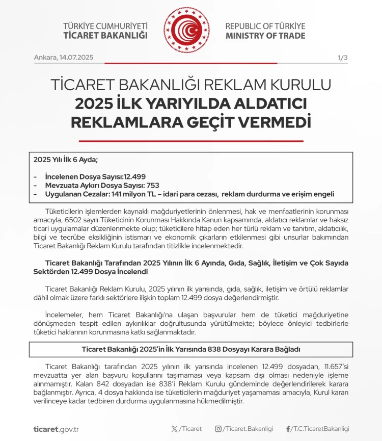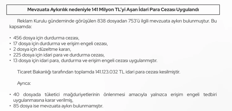 Ticaret Bakanlığı Reklam Kurulu, 2025’in ilk altı ayında 12.499 dosyayı inceleyerek 753’üne 141 milyon TL’yi aşan idari para cezası uyguladı, tüketicileri yanıltan reklamlara geçit vermedi.