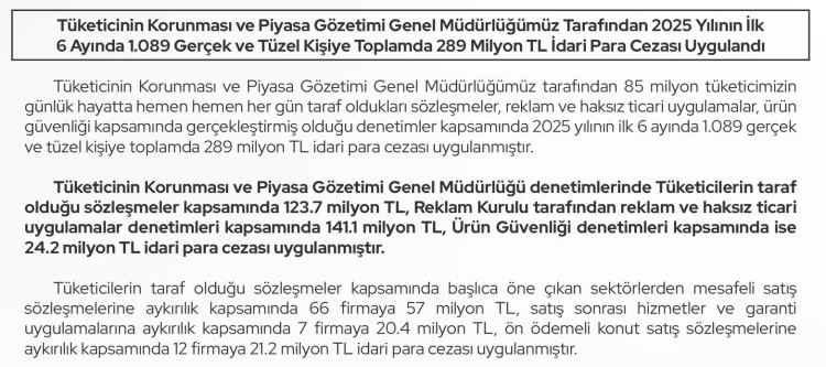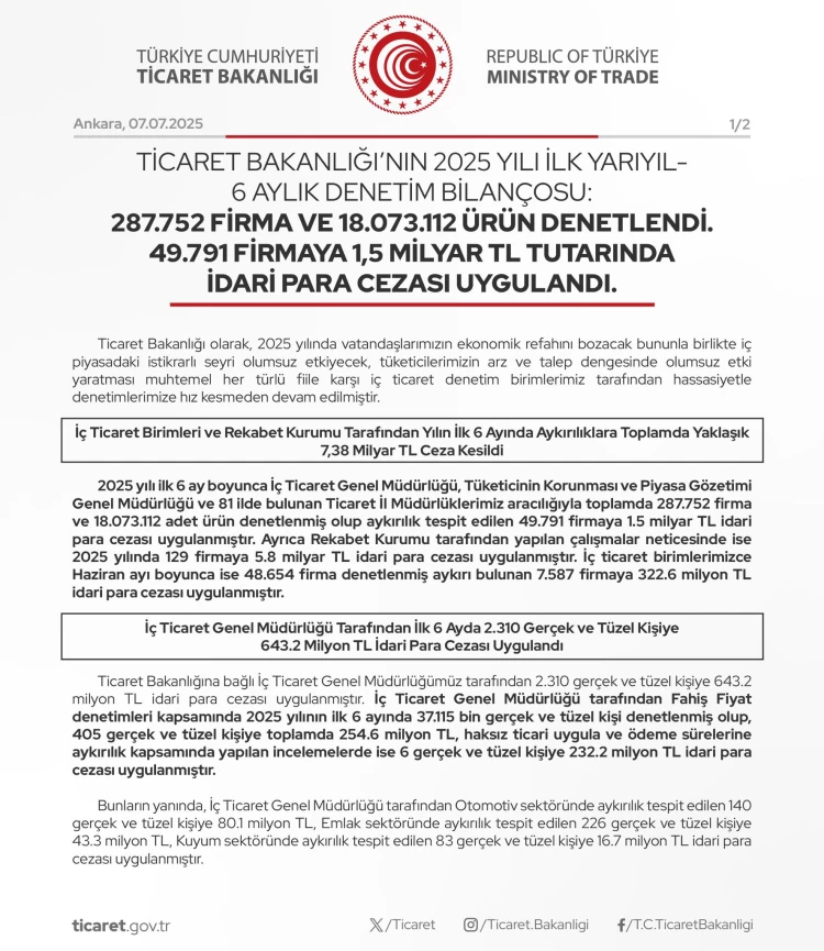 Ticaret Bakanlığı, 2025 yılının ilk 6 ayında 287.752 firma ve 18 milyon 73 bin 112 ürünü denetledi. Aykırılık tespit edilen 49.791 firmaya toplam 1,5 milyar TL idari para cezası uygulandı. Gıda endüstrisi, 3 milyar TL ile en yüksek ceza kesilen sektör oldu.