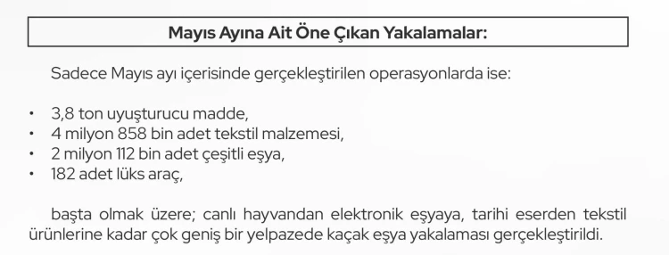 Bakanlık yazılı açıklamasında Mayıs ayına ait öne çıkan yakalamaları şöyle açıkladı: