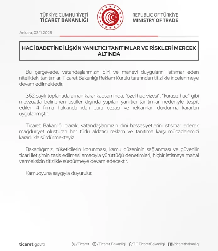 Ticaret Bakanlığı bünyesindeki Reklam Kurulu, hac ibadetine ilişkin yanıltıcı tanıtımlar yapan firmalara yönelik incelemesini tamamladı. “Kurasız hac” ve “özel hac vizesi” ifadeleriyle vatandaşları yanıltan 4 firmaya idari para ve reklam durdurma cezası verildi.