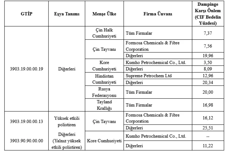 Soruşturma sonucunda uygulamaya konulan dampinge karşı önlemler, GTİP’e, eşya tanımına ve menşe ülkeye göre değişen oranlarda uygulanacak. Örneğin, Çin Halk Cumhuriyeti menşeli “diğerleri” polistiren ürününde yüzde 7,37, Hindistan menşeli bazı GPPS ürünlerinde yüzde 12,96, Tayland menşeli ürünlerde ise yüzde 16,98 oranında dampinge karşı vergi uygulanacak.