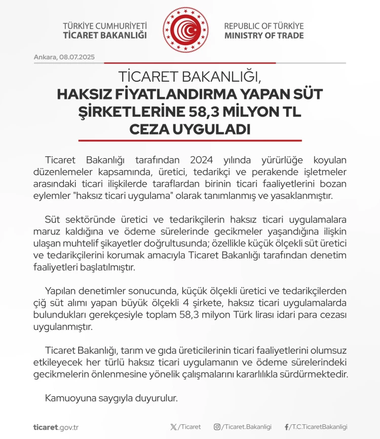 Ticaret Bakanlığı, süt sektöründe haksız ticari uygulamalar nedeniyle 4 büyük şirkete 58,3 milyon TL para cezası kesti. Bakanlık küçük üreticiler için denetimlerini sürdürüyor.