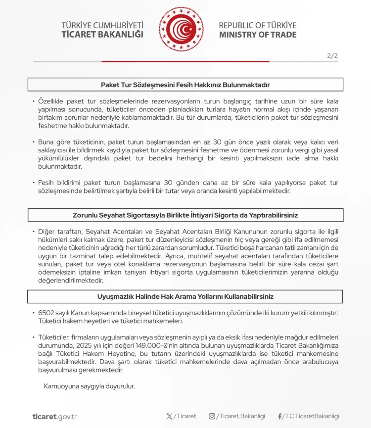 Ticaret Bakanlığı, yaz tatili ve Kurban Bayramı tatili öncesinde vatandaşları paket tur ve otel konaklama rezervasyonları konusunda uyardı.