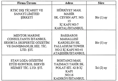 Tebliğe göre, 31 Aralık 2014 tarihli ve 29222 sayılı Resmi Gazete’de yayımlanan Uluslararası Gözetim Şirketi Statüsüne İlişkin Tebliğ (Ürün Güvenliği ve Denetimi: 2015/24) hükümlerine aykırı davrandığı tespit edilen RTSC Dış Ticaret ve Sanayi Limited Şirketi ile Mentor Marine Consultants İstanbul Sigorta Ekspertiz Gözetim ve Danışmanlık Hizmeti Ticaret Limited Şirketi’nin faaliyetleri 1'er ay, Stan Loza Gözetim Etüd Kontrol Servis Hizmet Ticaret Limited Şirketi’nin faaliyetleri ise 2 ay süreyle durduruldu.